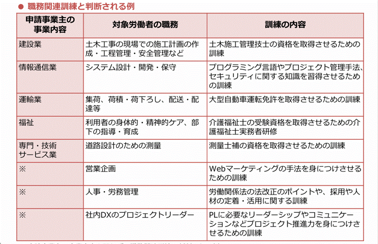 職務ごとに対象となる訓練の例は次表の通りです。