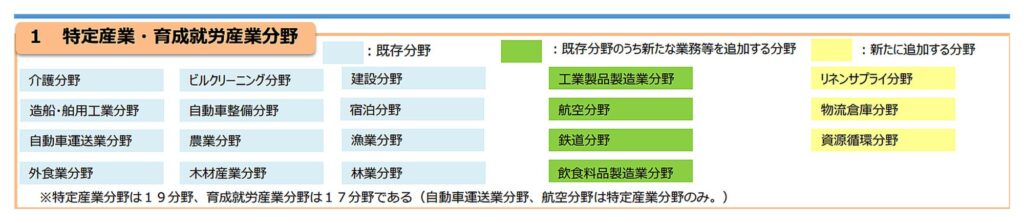 また対象分野は特定技能が19分野、育成就労が17分野とされ、今回新たに「リネンサプライ」「物流倉庫」「資源循環」 が追加となりました。